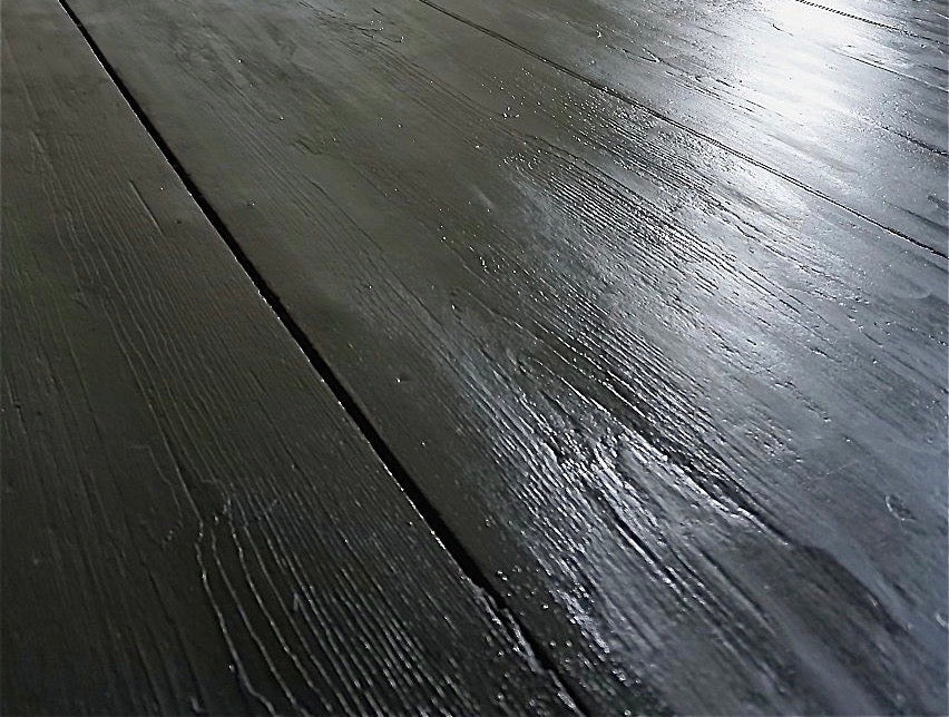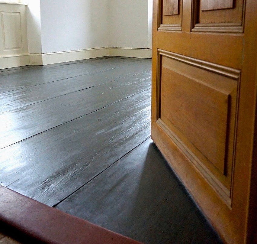 Obwohl der historische Dielenfußboden viele Gebrauchsspuren zeigt, wurde er nicht abgeschliffen, sondern nur gründlich mit Bio-Leinölseife kraftvoll gereinigt und mit gekochtem Leinöl geölt. Danach wurden er mit dunkelgrauer Leinölfarbe 3 mal gestrichen.
