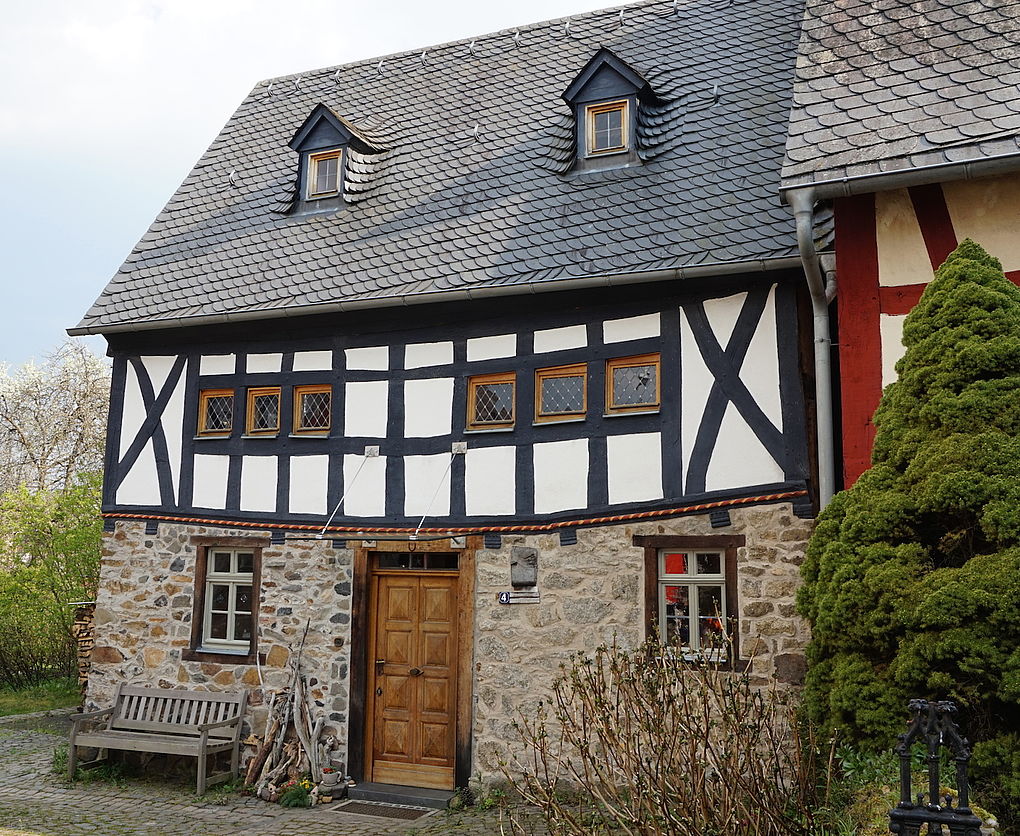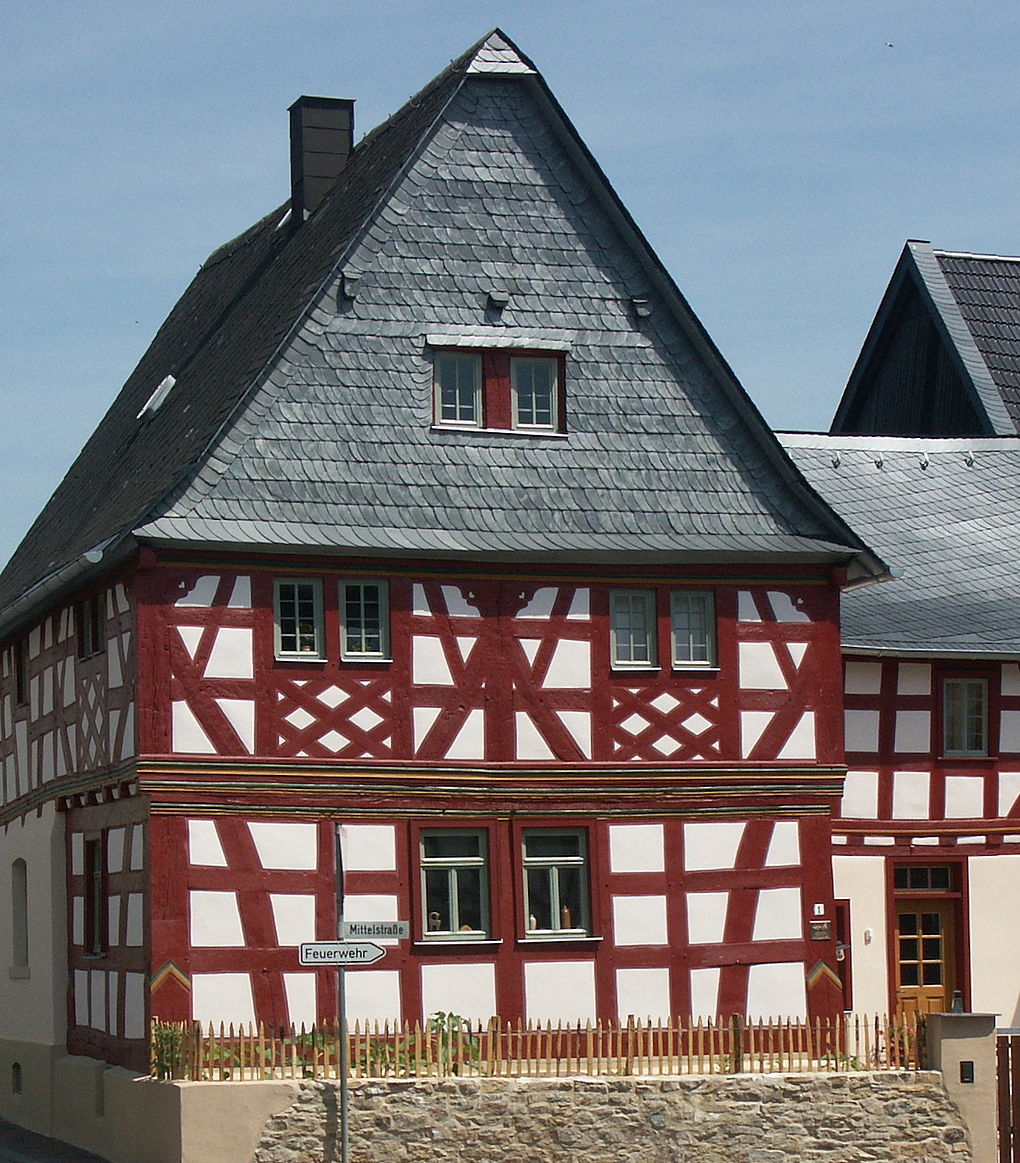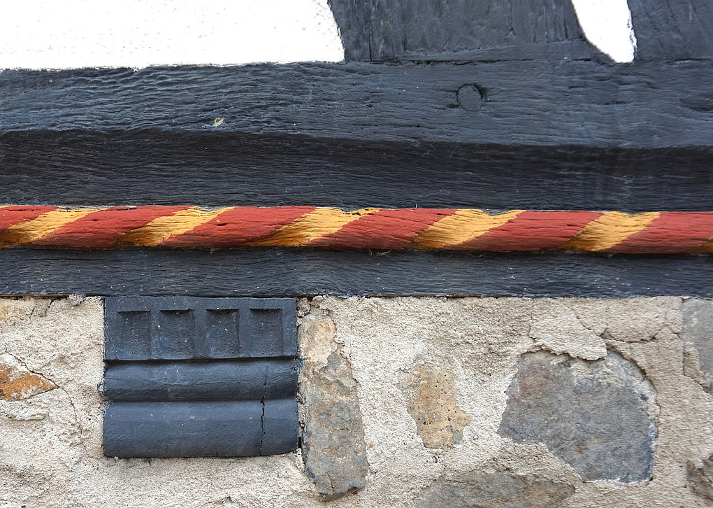 Das Fachwerk dieser Hofreite wurde in Eisenoxid rot gestrichen. Die Fenster haben einen Leinölfarbanstrich in Graugrün.