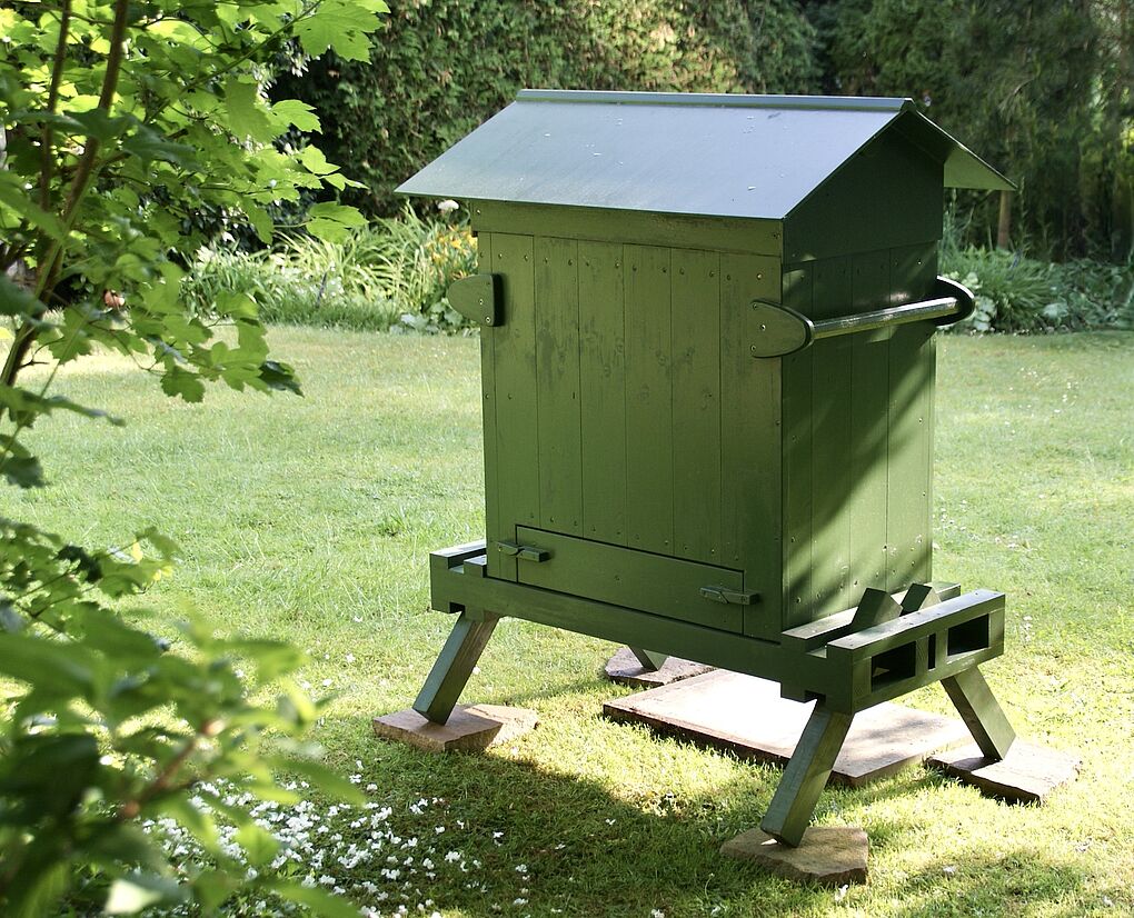 Hier ein besonders hübsches Beispiel einer Biensenbeute, gestrichen mit Ottosson Leinölfarbe in Blattgrün.
