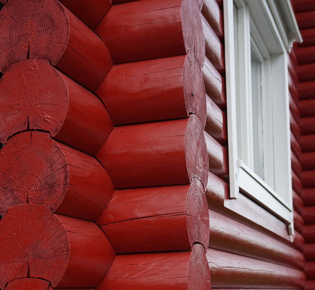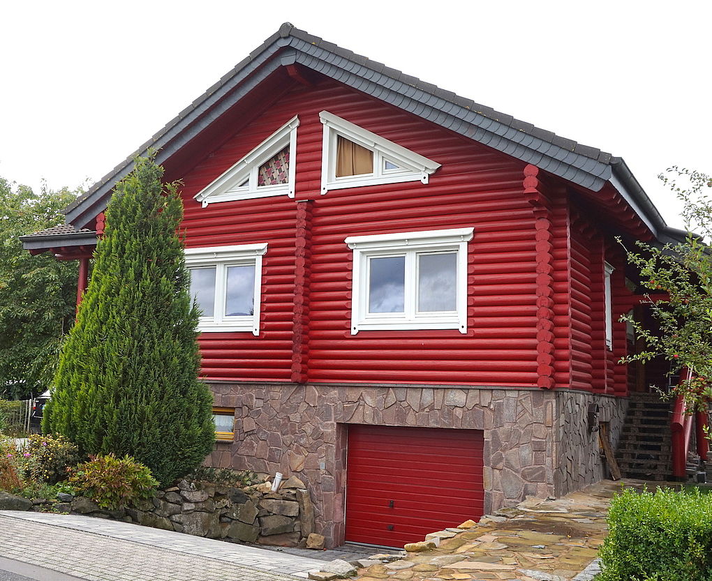 Die Besitzer dieses Blockhauses haben den abblätternden Erstanstrich händisch entfernt und die Fassaden sowie das Garagentor mit Ottosson Leinölfarbe Empir rot gestrichen. Für die Fenster und Fensterbekleidung wurde der Farbton hellgrau gewählt.
