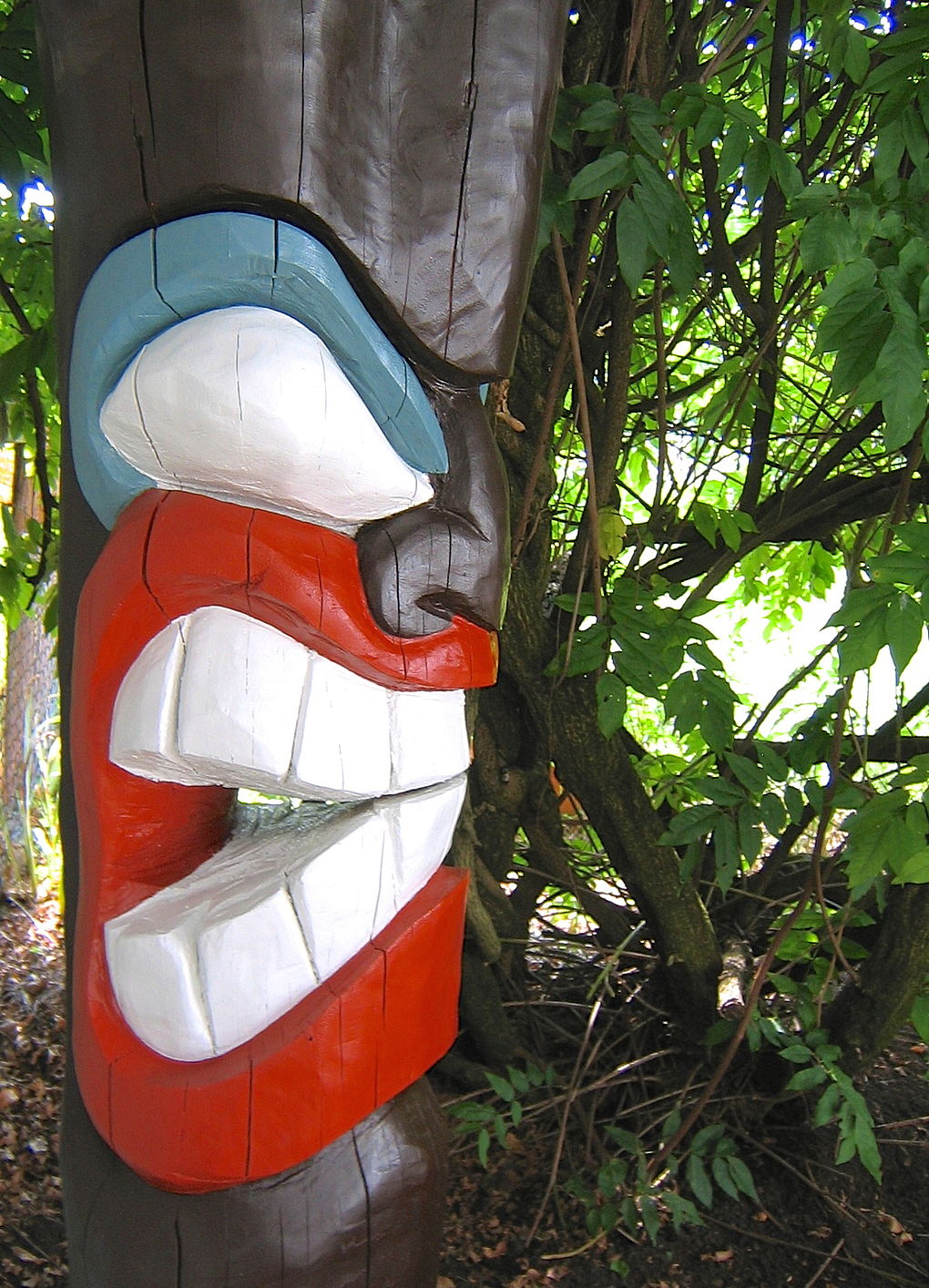 Bei diesen Stelen handelt es sich um "Upgrades" von Bäumen, welche auf einem privaten Garten wegen mehr Lichtbedarf gefällt wurden. Als "Tikis" haben die Baumstümpfe nun ein neues Leben erhalten.