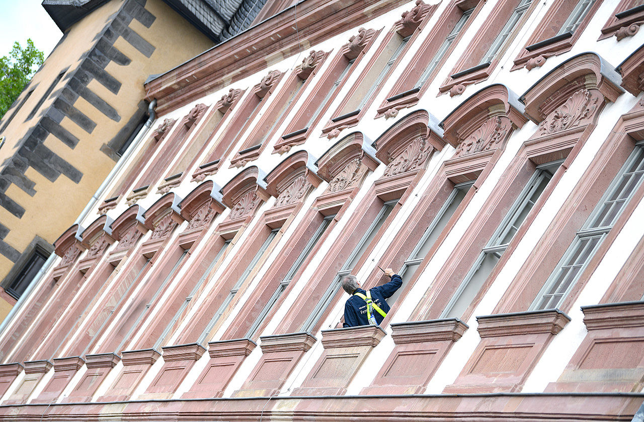 Die Fenster des Bernusbaus wurden im Farbton "Warmgrau" gestrichen. Auf dem Foto sehen Sie einen Mitarbeiter der Mosler Restaurierungen GmbH bei der der in diesem Sommer durchgeführten Pflegemaßnahme. Als Pflege werden die farbigen Oberflächen, ca. 8 Jahre nach der Umstellung auf Leinölfarbe, einfach mit gekochtem Leinöl aufgefrischt.