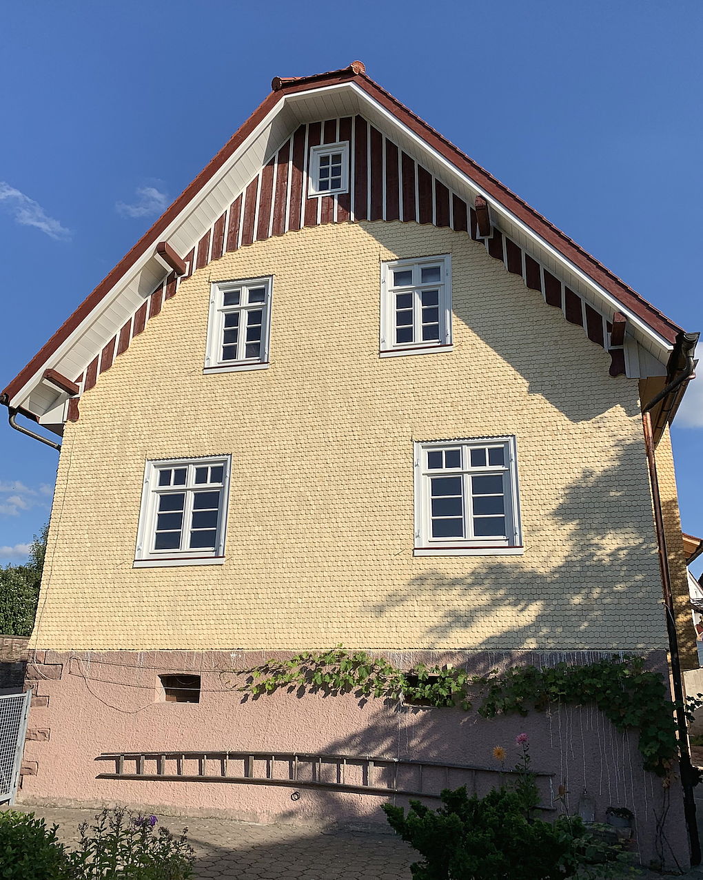Nach der Entfernung der alten Lackschichten mittels Sandstrahlung bekam die Schindelfassade einen komplett neuen Anstrichaufbau mit Ottosson Leinölfarbe im Farbton Hellgelb.