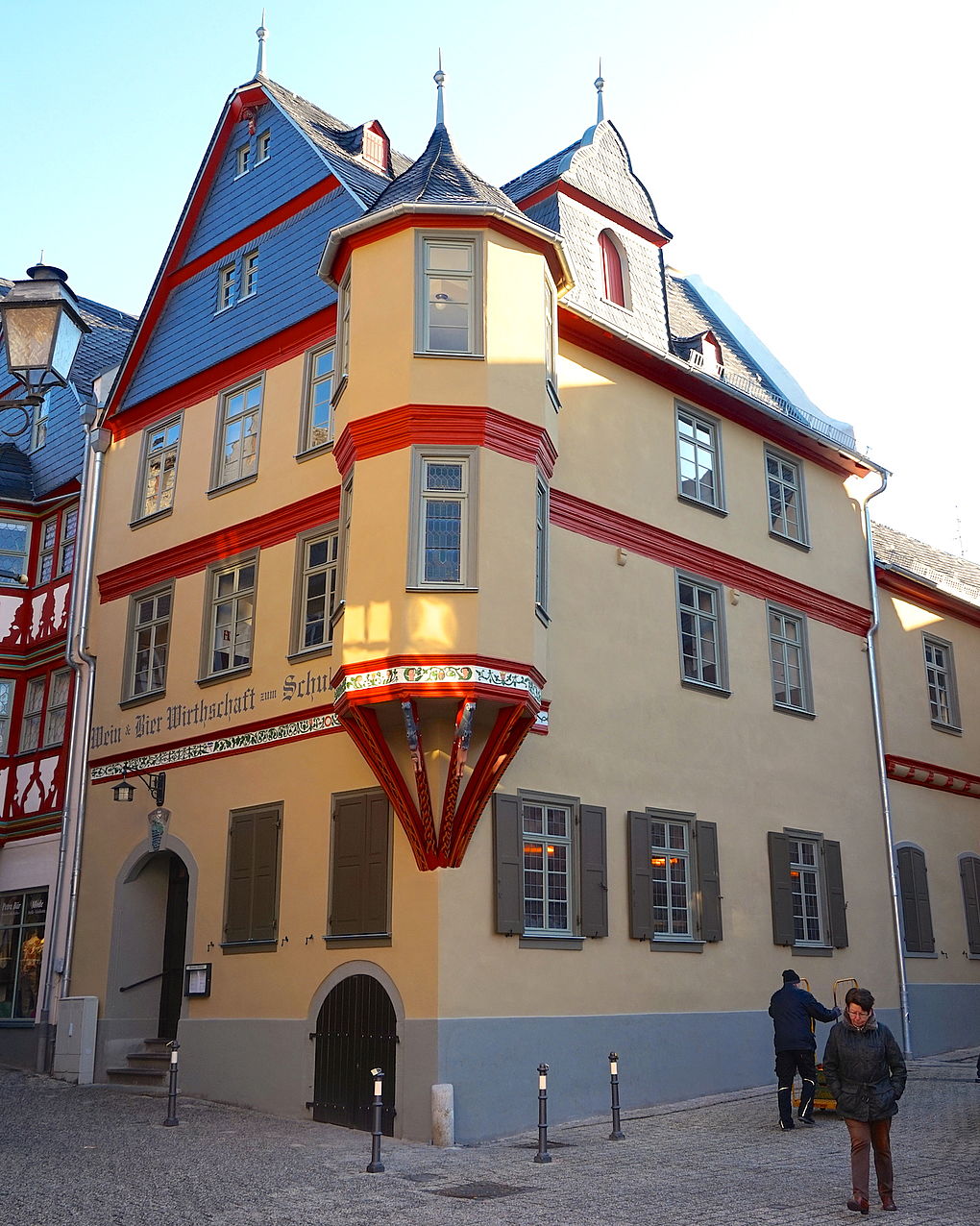 Das denkmalgeschüzte Weinhaus Schultess fällt Besuchern auch heute noch durch den verzierten Holzerker auf, der biblische Szenen zeigt.