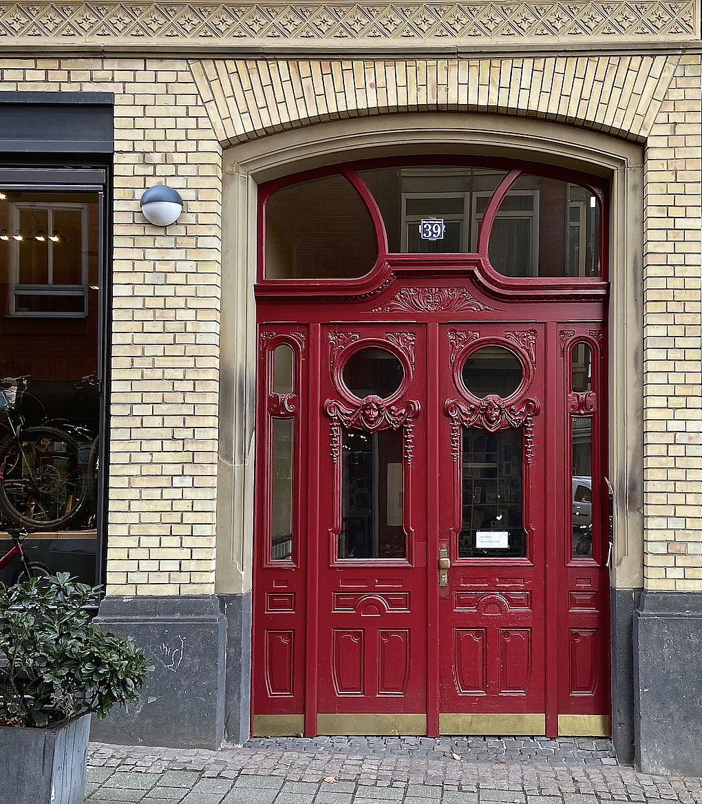 Die Haustüre aus der Zeit des Jugendstils strahlt nach der Renovierung im Sonderfarbton RAL 3003 (gemischt als Sonderfarbton nach Befund aus Ottosson Leinölfarben)