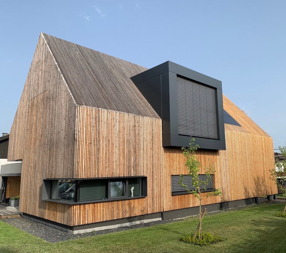 Ein Einfamilienhaus in klassischen Proportionen mit steilem Giebeldach wurde modern interpretiert. Die gleichmäßige flächige Dach- und Fassadengestaltung mit naturbelassenen Holzleisten unterstreicht die kubische Wirkung des Gebäudes. Akzente setzen die wenigen Baudetails, wie Fensterbänder und Gaube, die mit Leinölfarbe im Ton Eisenoxyd-Schwarz gestrichen wurden.